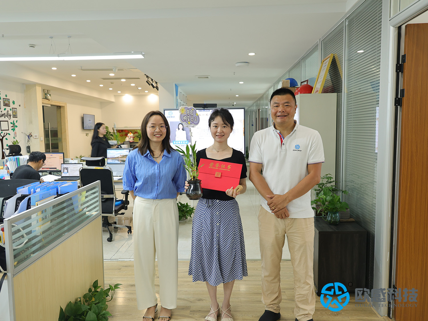 8月14日上午,歐感在杭州行政辦公室組織了簡單而熱鬧的2023年七月明星員工表彰儀式。在杭全體同事集會(huì),由部門經(jīng)理宣讀頒獎(jiǎng)詞,歐感創(chuàng)始人毛宇新為明星員工逐一頒獎(jiǎng)。