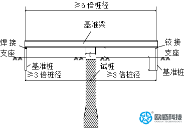 依據(jù)自平衡樁基檢測規(guī)范,基準梁一端與基準樁鉸接,另一端與基準樁焊接?;鶞柿洪L度應(yīng)不小于試樁樁徑的6倍(總長不小于2米),以樁中心為中心,每邊各3倍樁徑,搭設(shè)在試樁的正上方;基準樁應(yīng)打入足夠的深度,一般不小于1.5米。