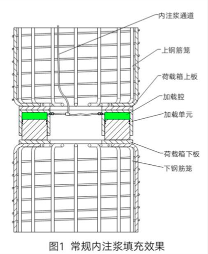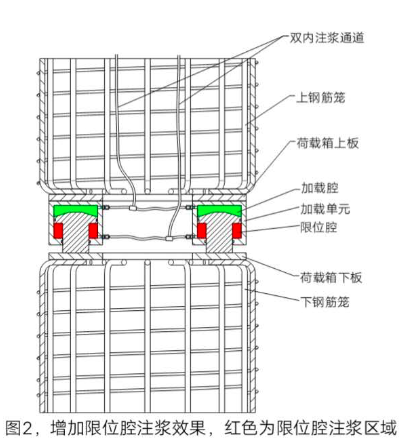 為解決此工程問題, 歐感研制開發(fā)了荷載箱限位技術,并于近期申請了專利。這種新型結構的荷載箱,在內部設置了限位腔(如下圖)。不論在試驗過程中荷載箱產生多大的行程,只要在試驗后進行注漿,就能限制加載腔體內外的相對移動,加載腔體內外結構分別與樁體上、下部鋼筋籠連接,確保荷載箱設備可以用作上下樁的剛性連接體,從而有效地發(fā)揮出工程樁的抗壓、抗拔和抗剪切作用 。