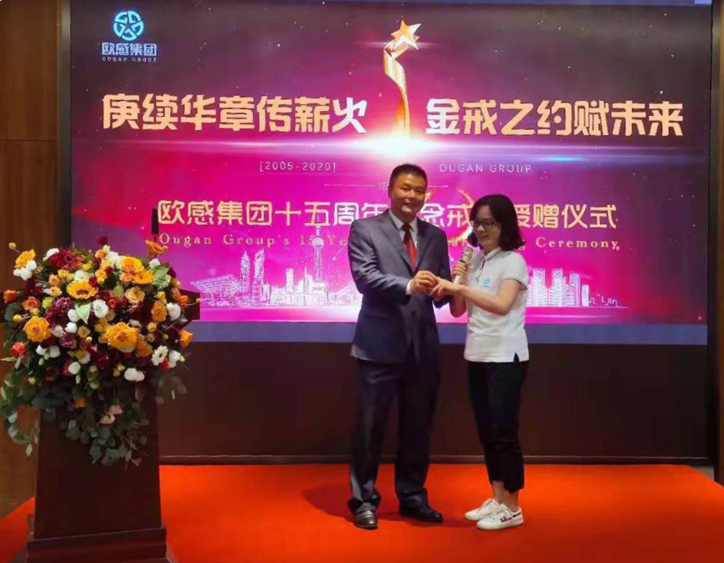 今天儀式的主題是“庚續(xù)華章傳薪火,金戒之約賦未來”?;厥讱W感走過的15年,我們歷經(jīng)了變遷;在變遷中,我們經(jīng)受了洗禮;在洗禮中,我們收獲了成長(zhǎng)。今天,我選擇了這樣一個(gè)特殊的方式,為每一位歐感人定制了一枚戒指,給歐感的成長(zhǎng)留下一個(gè)紀(jì)念,也對(duì)我們的未來做一個(gè)約定。 讓我們繼承“客戶至上”、 “革故鼎新”、“以終為始”,“礪德同心”的寶貴財(cái)富,開創(chuàng)出歐感下一個(gè)更絢麗的十五年。