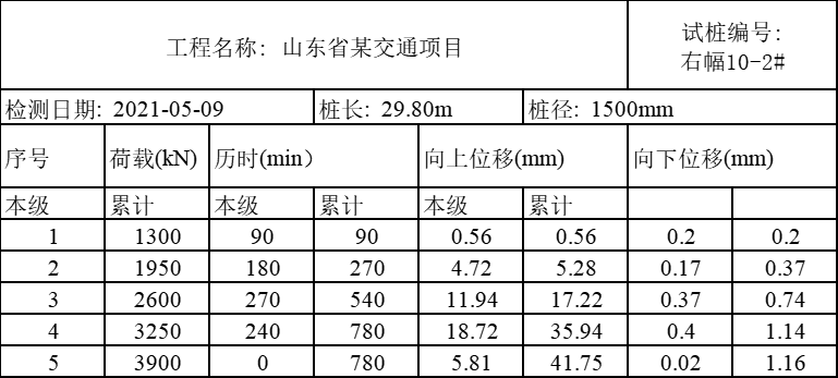 樁號右幅10-2#,樁徑1.5m,樁長:29.8米,沖擊鉆成孔,荷載箱埋設(shè)樁端上3米,單樁豎向極限承載力:13000KN,荷載箱加載噸位:6500KN;實際檢測過程中荷載值加載到3900KN,上段樁樁身向上整體滑動,上位移平均位移:41.75mm,下位移平均位移:1.16mm,如下表2附具體測試位移數(shù)據(jù),附具體曲線圖。
