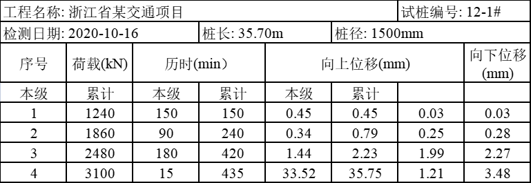 樁號12-1#,樁徑1.5m,樁長:35.7米,沖擊鉆成孔,荷載箱埋設(shè)樁端上2米,單樁豎向極限承載力:12400KN,荷載箱加載噸位:6200KN;實際檢測過程中荷載值加載到3100KN,上段樁樁身向上整體滑動,上位移平均位移:35.75mm,下位移平均位移:3.48mm,如下表1附具體測試位移數(shù)據(jù),附具體曲線圖。