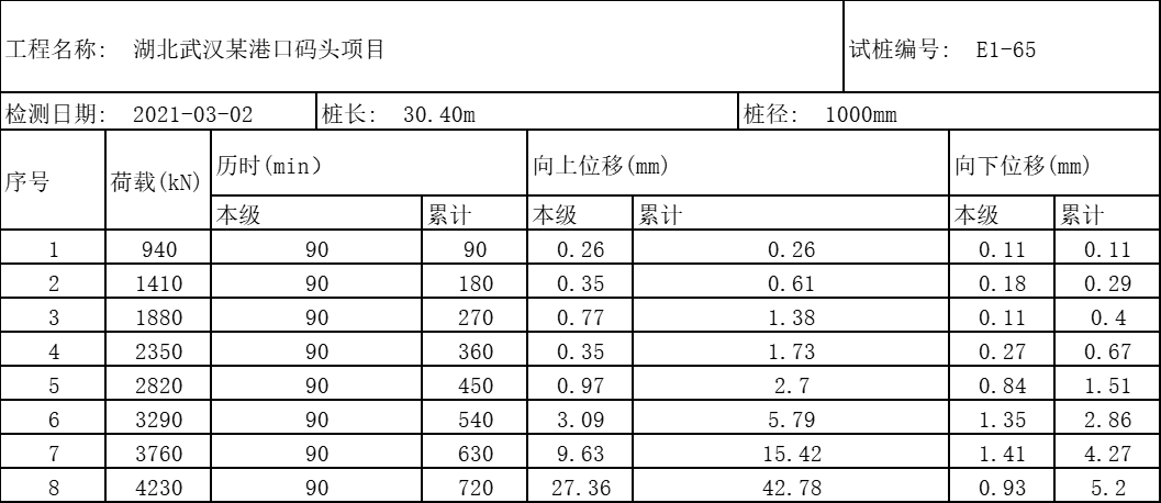 樁號 E1-65#,樁徑1.0m,樁長:30.4米,沖擊鉆成孔,荷載箱埋設(shè)樁端上2米,單樁豎向極限承載力:9334KN,荷載箱加載噸位:4700KN;實際檢測過程中荷載值加載到4230KN,上段樁樁身向上整體滑動,上位移平均位移:42.78mm,下位移平均位移:5.20mm,如下表3附具體測試位移數(shù)據(jù),附具體曲線圖。